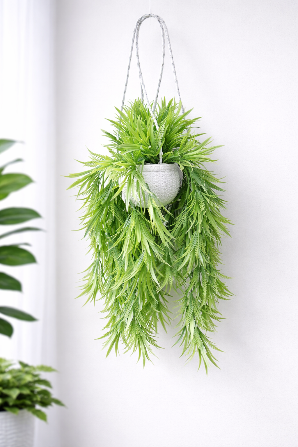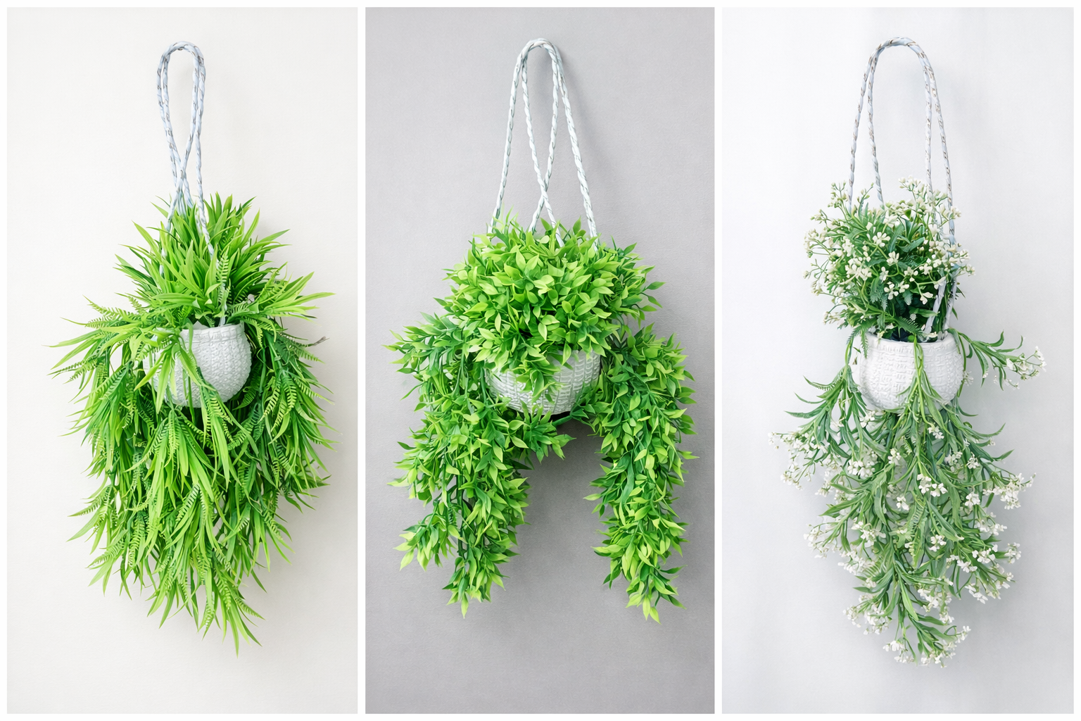 - Transform your living space into a lush oasis with our exquisite collection of four different types of hanging plants. Each plant is carefully selected for its unique beauty and air-purifying qualities, making them perfect for any home or office environment. From the cascading vines of the Pothos to the delicate leaves of the String of Hearts, these plants not only add a touch of greenery but also enhance your indoor air quality.
